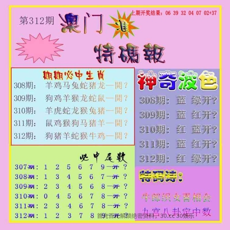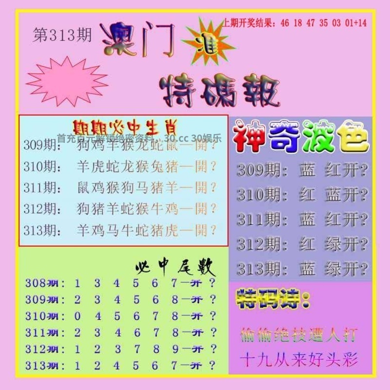 314期:独解傳眞 解:本期四六合数开,牛郎七夕鹊桥会。金鸡报晓在三更,运转乾坤化特码。十七十八正少年,山林无虎是老大。金银财福随手招,特码出在姐妹花。 送:猴牛羊鸡虎猪兔蛇 抓住一句解必中特 |