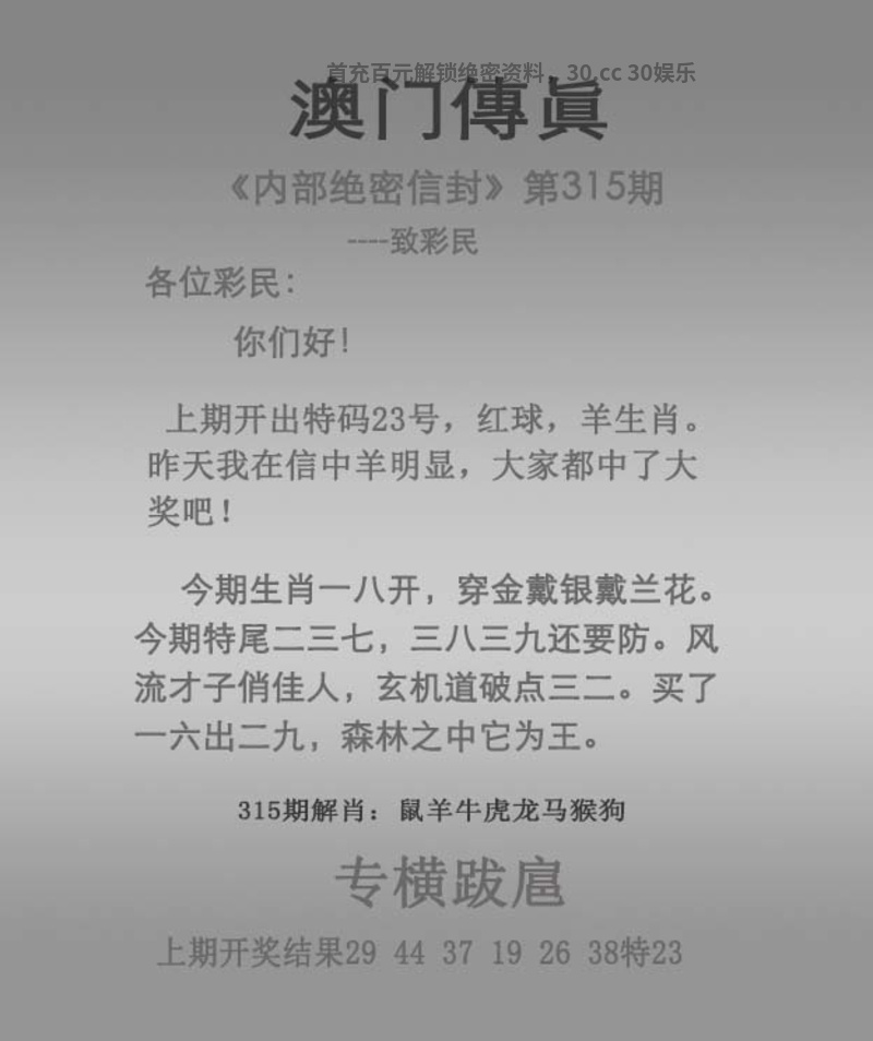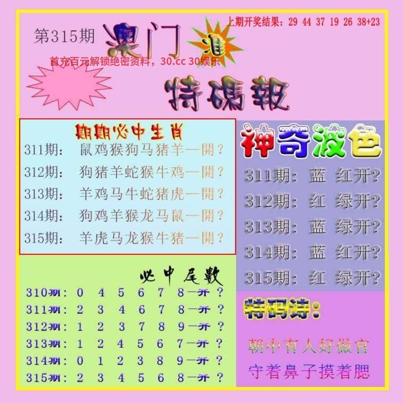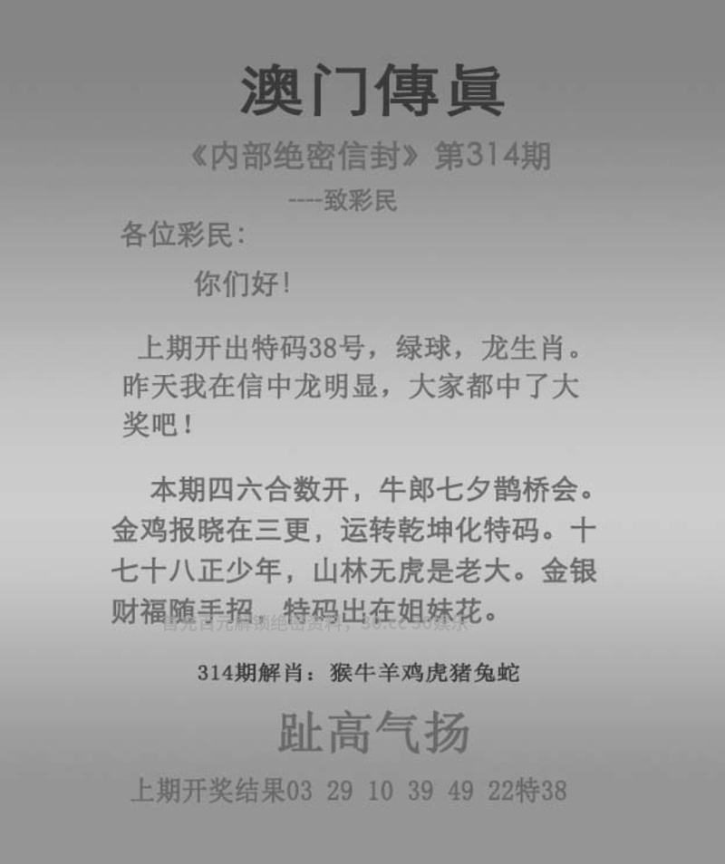 315期:独解傳眞 解:今期生肖一八开,穿金戴银戴兰花。今期特尾二三七,三八三九还要防。风流才子俏佳人,玄机道破点三二。买了一六出二九,森林之中它为王。 送:鼠羊牛虎龙马猴狗 抓住一句解必中特 |